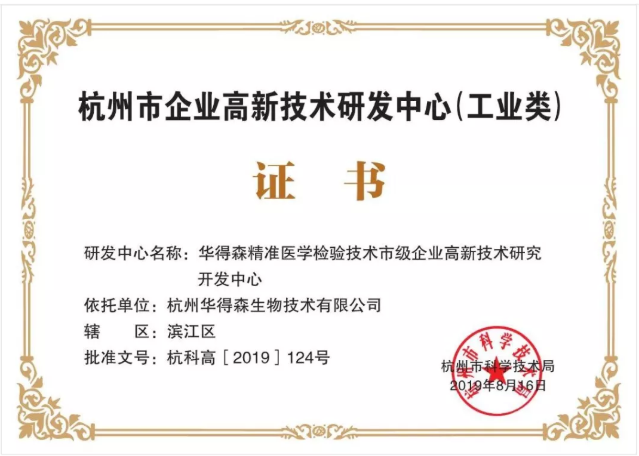2019年7月,2019年杭州市企业高新技术研发中心拟建名单揭晓。此次通过认定的企业共390家,杭州华得森生物技术有限公司也在其中。这也进一步证实了华得森的技术力量和创新能力。